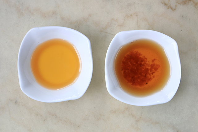 第二次炼油:过滤掉姜葱香菜等,把剁碎的蒜蓉倒入热油中,至金黄色即可。(附图左为生油,右为熟油)